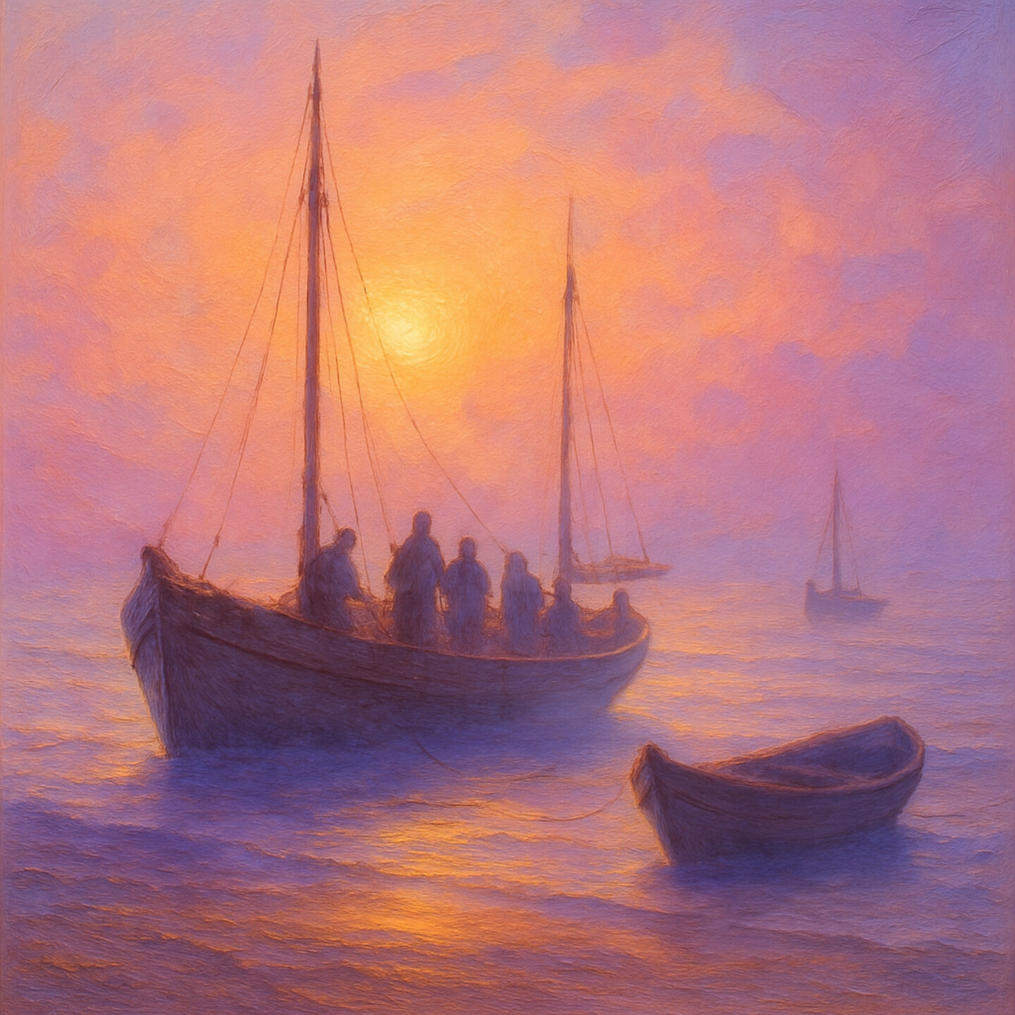 Figures in a boat surrounded by light; the human dissolves into the universal – the sea becomes a sea of stars.